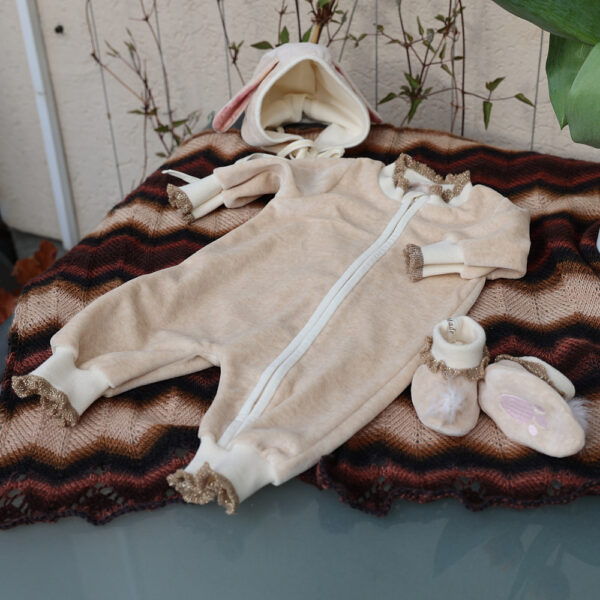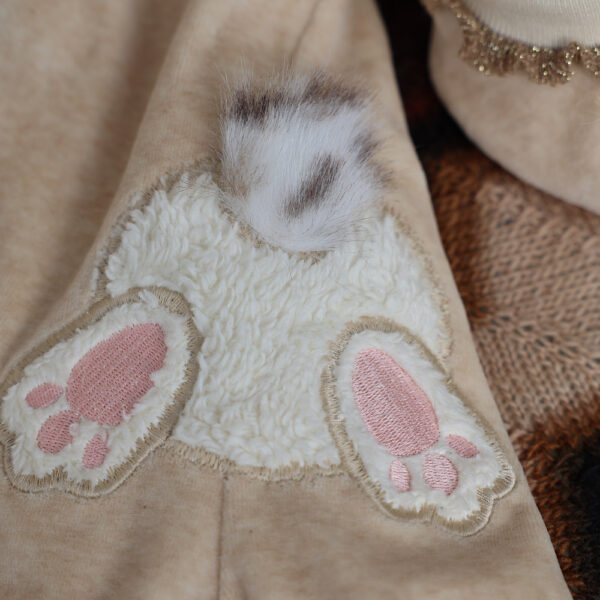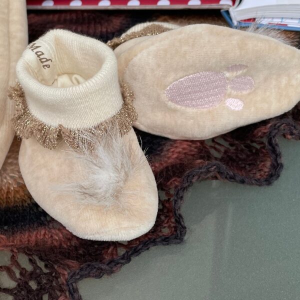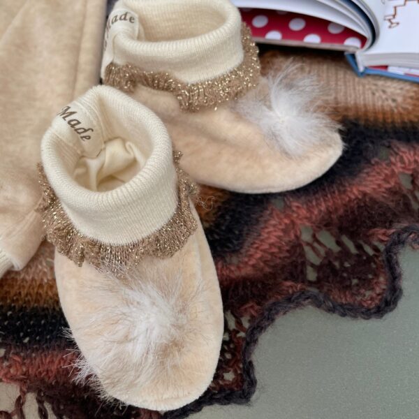 Applikation aus Baumwollteddy, Baumwollbündchen mit Goldrüschen.